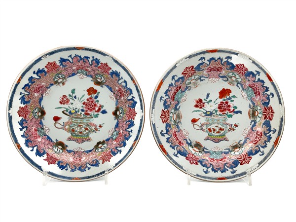 Coppia di piatti in porcellana policroma Famiglia Rosa con soggetto naturalistico e decoro floreale