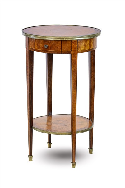 Tavolino bouillotte di forma circolare con profili in ottone, gambe rastremate riunite da pianetto e tiretto nella fascia (h cm 74; d cm 44) (difetti)