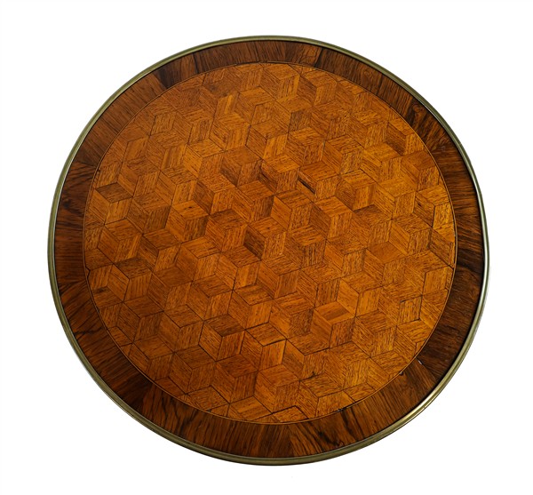 Tavolino bouillotte di forma circolare con profili in ottone, gambe rastremate