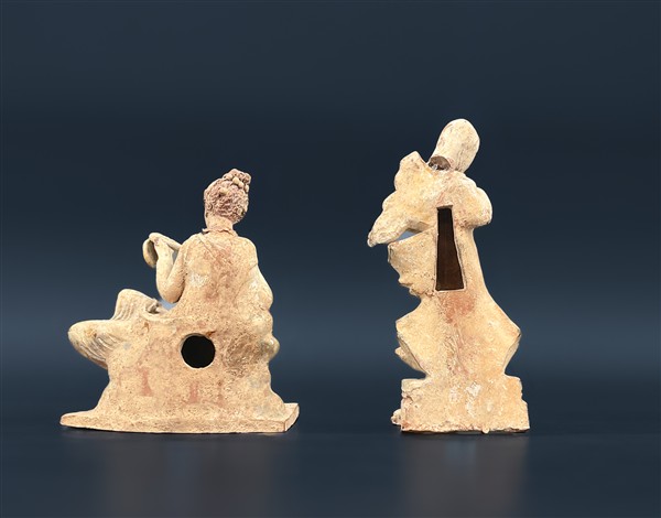 Coppia di antiche figurette in terracotta in stile Tanagra con tracce di policr