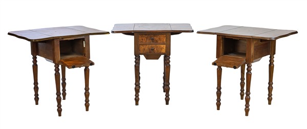 Gruppo di tre tavolini ad alette in legni vari con gambe tornite, due cassetti
