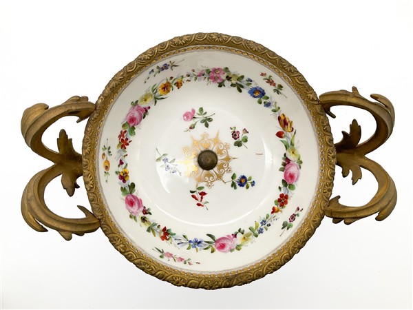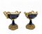 Manifattura francese, secolo XIX. Coppia di alzate a coppa biansata in porcellana blu con cavetto dipinto a fiori policromi, montatura e anse a forma di volute fogliate in metallo dorato (h cm 22,5) (difetti)
