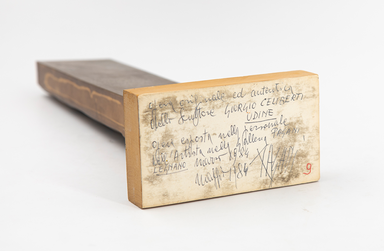 Firma e dichiarazione di autenticità e provenienza del gallerista Pagani sotto la base con numero di esemplare (Esemplare 9)