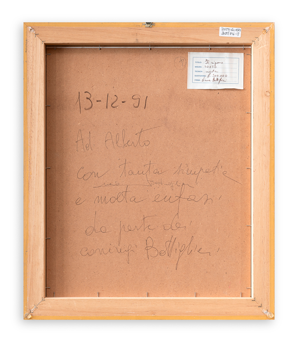 Firma e dedica ad personam al retro della tavola protettiva
