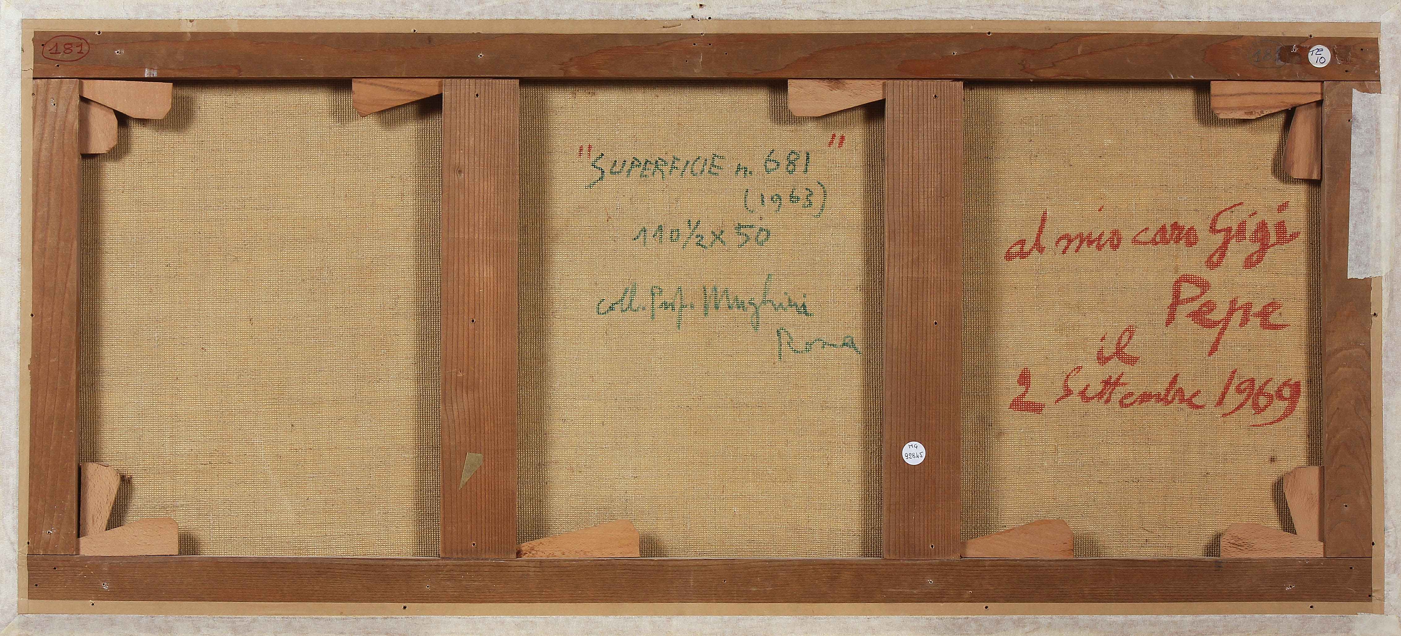 CAPOGROSSI GIUSEPPE (1900 - 1972) Superficie 681. 1963. Tempera su carta intelata. Cm 110,00 x 50,00. Firma in basso a destra. Al retro titolo, anno e dedica. Autentica su fotografia a cura della Galleria Bergamini, Milano e della Galleria Tega, Milano. Certificato di autenticità a cura di Telemarket spa, Roncadelle (Bs). Pubblicazioni: Catalogo delle opere di Capogrossi 1967 - 1972, seconda parte, Edizioni del Naviglio, Milano 1974 a cura di Guglielmo Capogrossi.