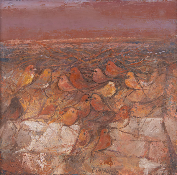 CARLO PANZAVOLTA, "Uccellini nel paesaggio", 2011, olio su tela, cm 26x25