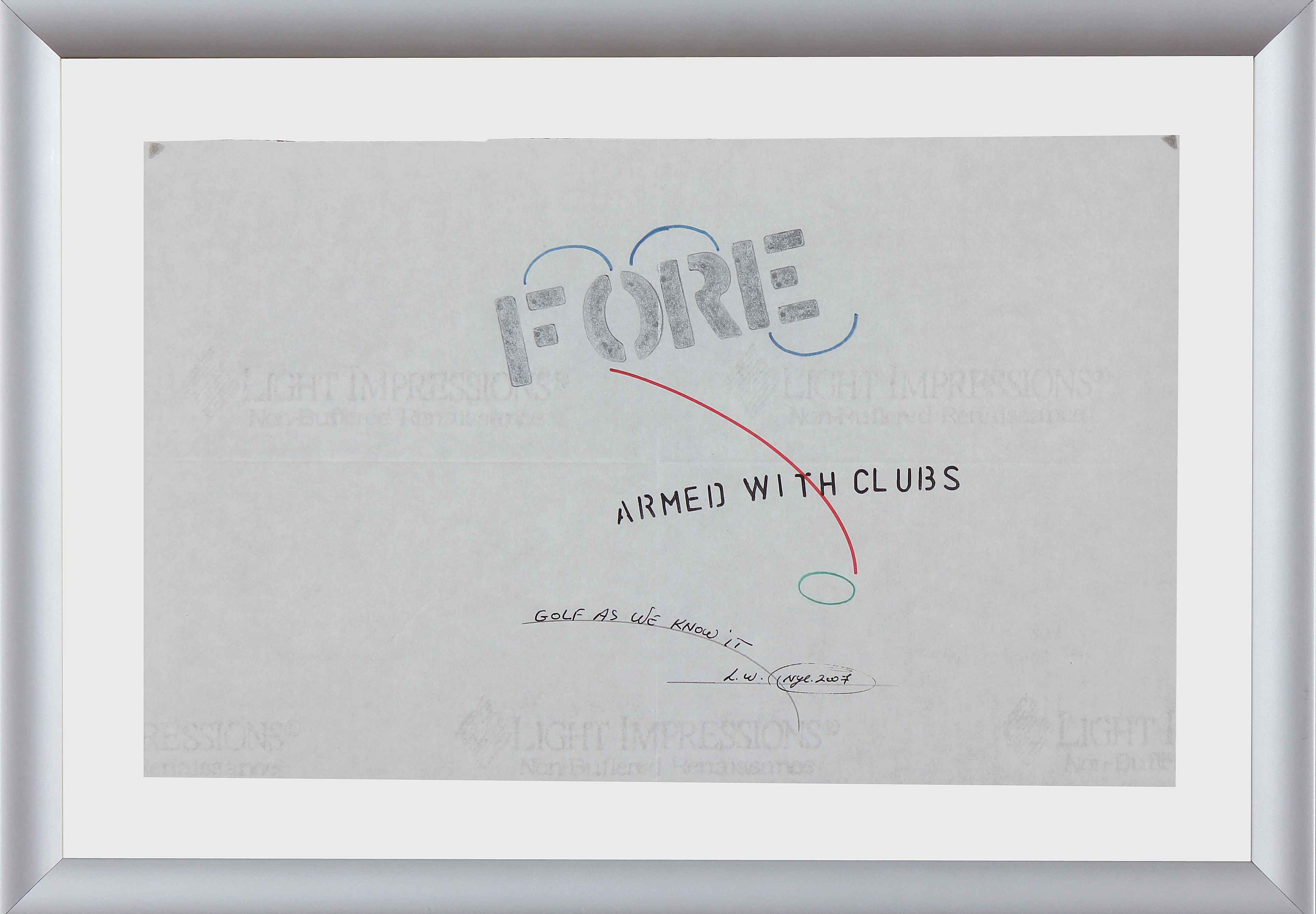 WEINER LAWRENCE (n. 1942) Golf as we know it. 2007. Tecnica mista su carta. Cm 41,00 x 26,00. Titolo e firma in basso a pennarello. Pubblicazioni: The Art of Golf, Cleek, a cura di Gianni Salvaterra, Edizioni Artestampa Arte, 2007, catalogo della mostra tenuta presso il Royal Golf Silver Trophy, Ponterosso Challenge, Trieste, dal 22 al 24 Giugno 2007. Cornice presente