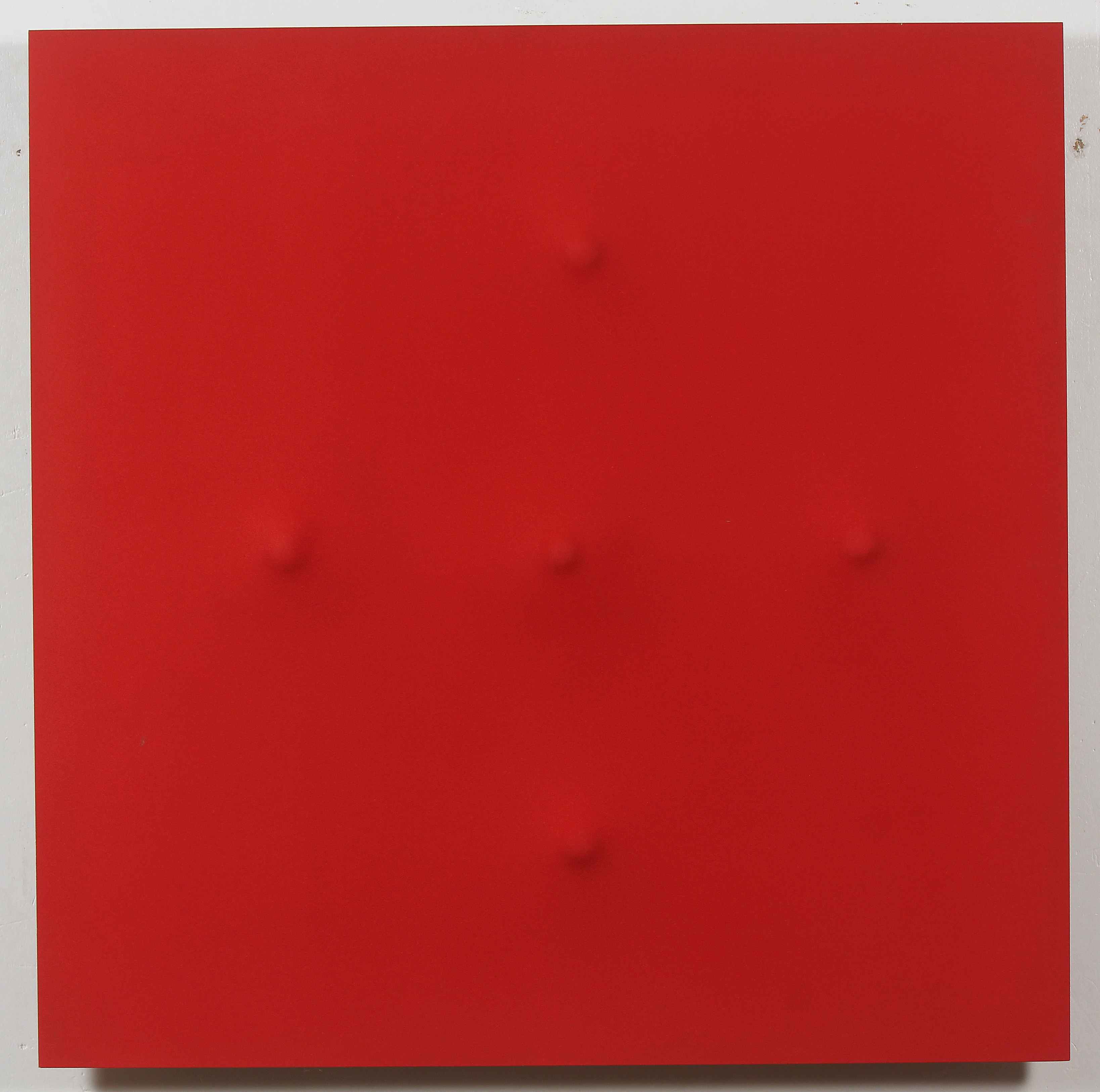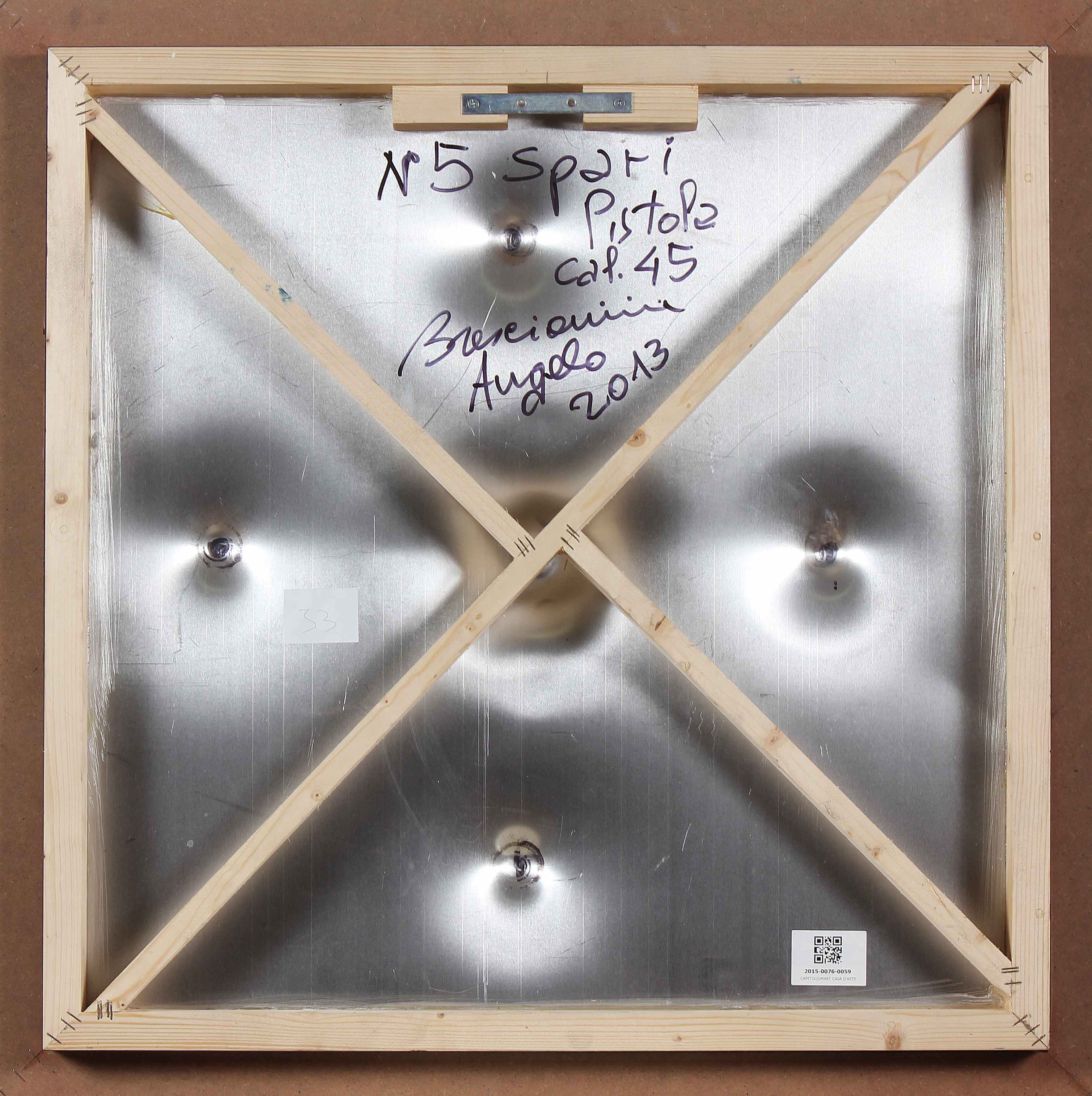 BRESCIANINI ANGELO (n. 1948) N. 5 spari di pistola cal.45. 2013. Tecnica mista su tavola. Cm 80,00 x 80,00. Al retro titolo, firma e anno. Autentica dell'artista su fotografia.