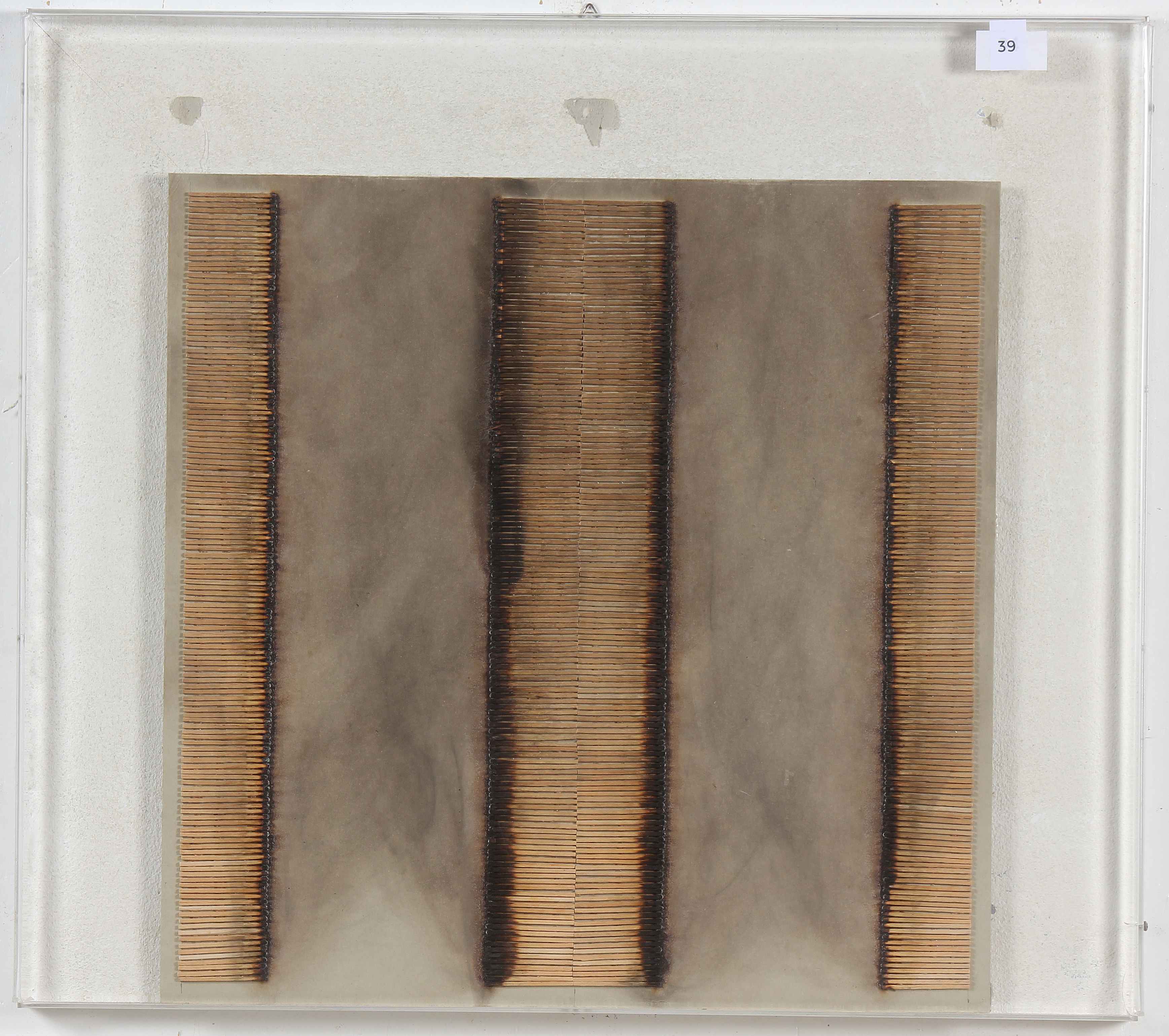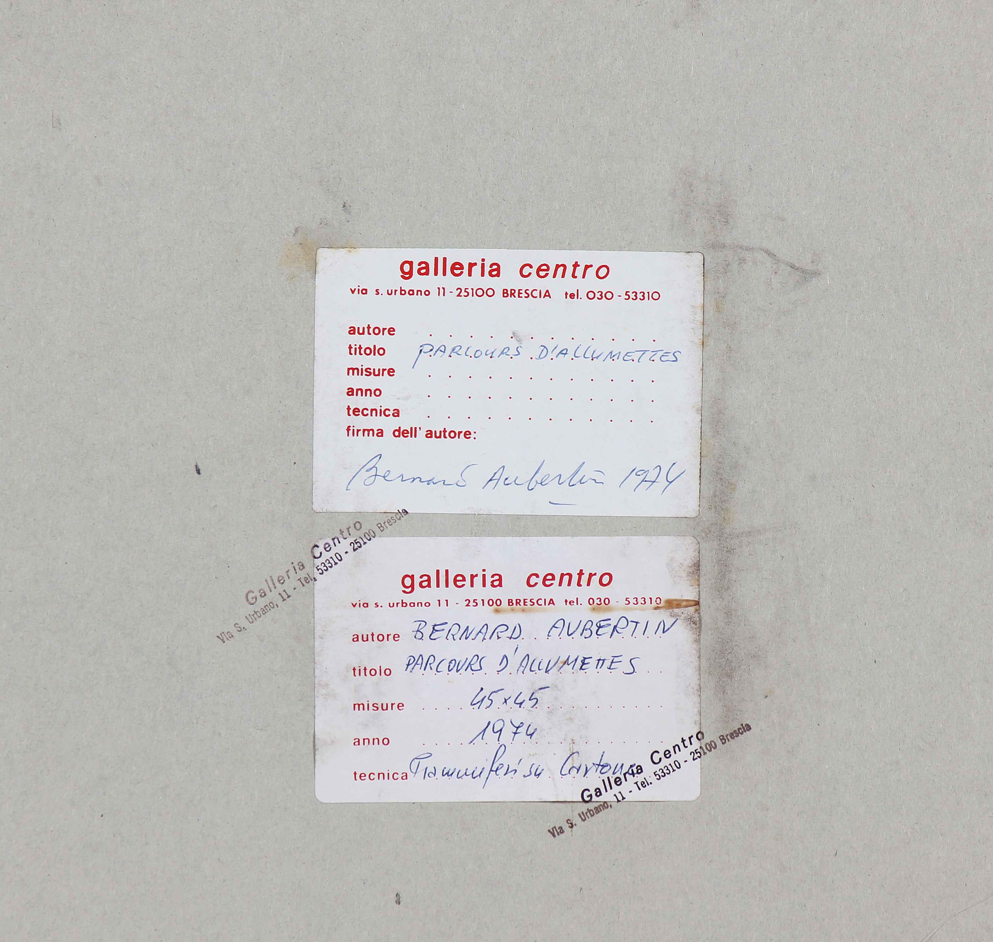 AUBERTIN BERNARD (n. 1934) Parcours d'allumettes. 1974. Fiammiferi su cartone. Cm 45,00 x 45,00. Al retro cartiglio descrittivo a cura della Galleria Centro, Brescia, firmato e datato dall'artista. Autentica dell'artista su fotografia. Cornice presente
