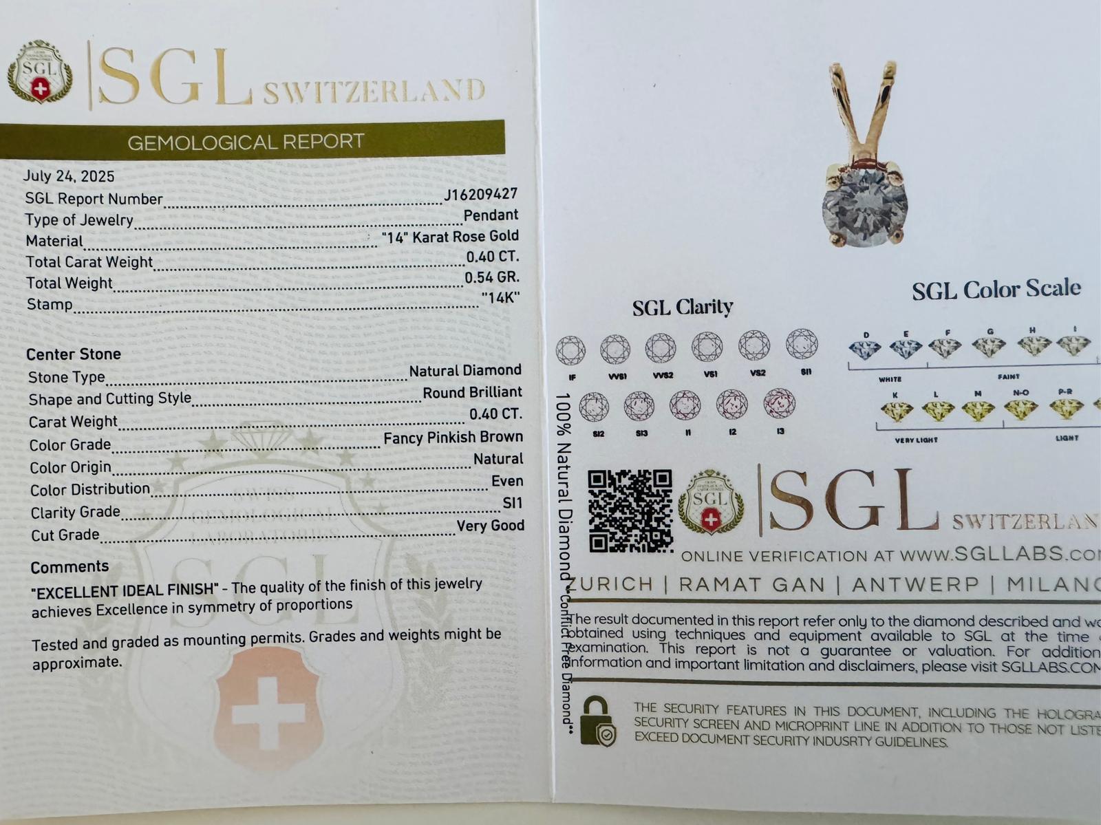 QUESTO ELEGANTE CIONDOLO È REALIZZATO IN ORO ROSA 14K CON UN PESO DI 0,54 GRAMMI. AL CENTRO È INCASTONATO UN DIAMANTE NATURALE DA 0,42 CARATI, CARATTERIZZATO DA UN TAGLIO ROTONDO E DA UNA RARA TONALITÀ FANCY PINK BROWN. LA PUREZZA SI1 GARANTISCE UNA PIETRA DI ALTA QUALITÀ CON INCLUSIONI MINIME, VISIBILE SOLO AD INGRANDIMENTO. LA MONTATURA A GRIFFE ESALTA LA BRILLANTEZZA DEL DIAMANTE, RENDENDO QUESTO GIOIELLO PERFETTO PER UN LOOK SOFISTICATO E UNICO, IDEALE SIA PER L'USO QUOTIDIANO CHE PER OCCASIONI SPECIALI.PND50701 - COMMISSIONE D’ASTA 25%