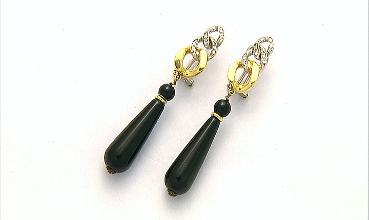 COPPIA DI ORECCHINI. In oro giallo e bianco 18 kt, perno e clip, realizzati a doppio corpo con settori a maglia groumette in diamanti taglio huit-huit per tot. cts. 0,15 ca. ed inserti oscillanti in onice.