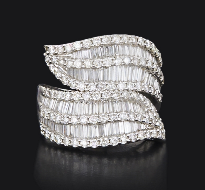 ANELLO. In oro bianco 18 kt montatura con disposizione a contrariè decorata da diamanti taglio baguette incastonati a binario e taglio brillante su griffes per tot. cts. 3,30 ca.