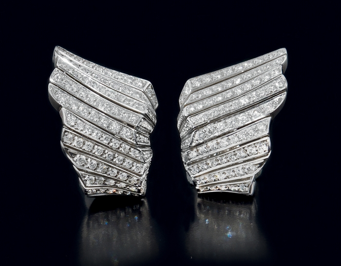 COPPIA DI ORECCHINI DI DAMIANI. In oro bianco 18 kt perno e clip realizzati a settori gradinati sfalsati impreziositi da diamanti taglio brillante per tot. cts. 3,20 ca.