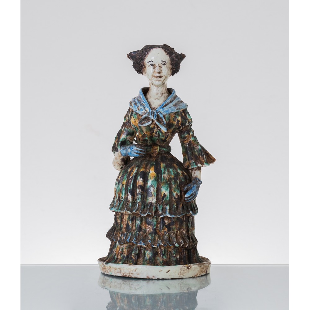 Lumiera in ceramica smaltata policroma raffigurante "Figura femminile con fiori" (usure).