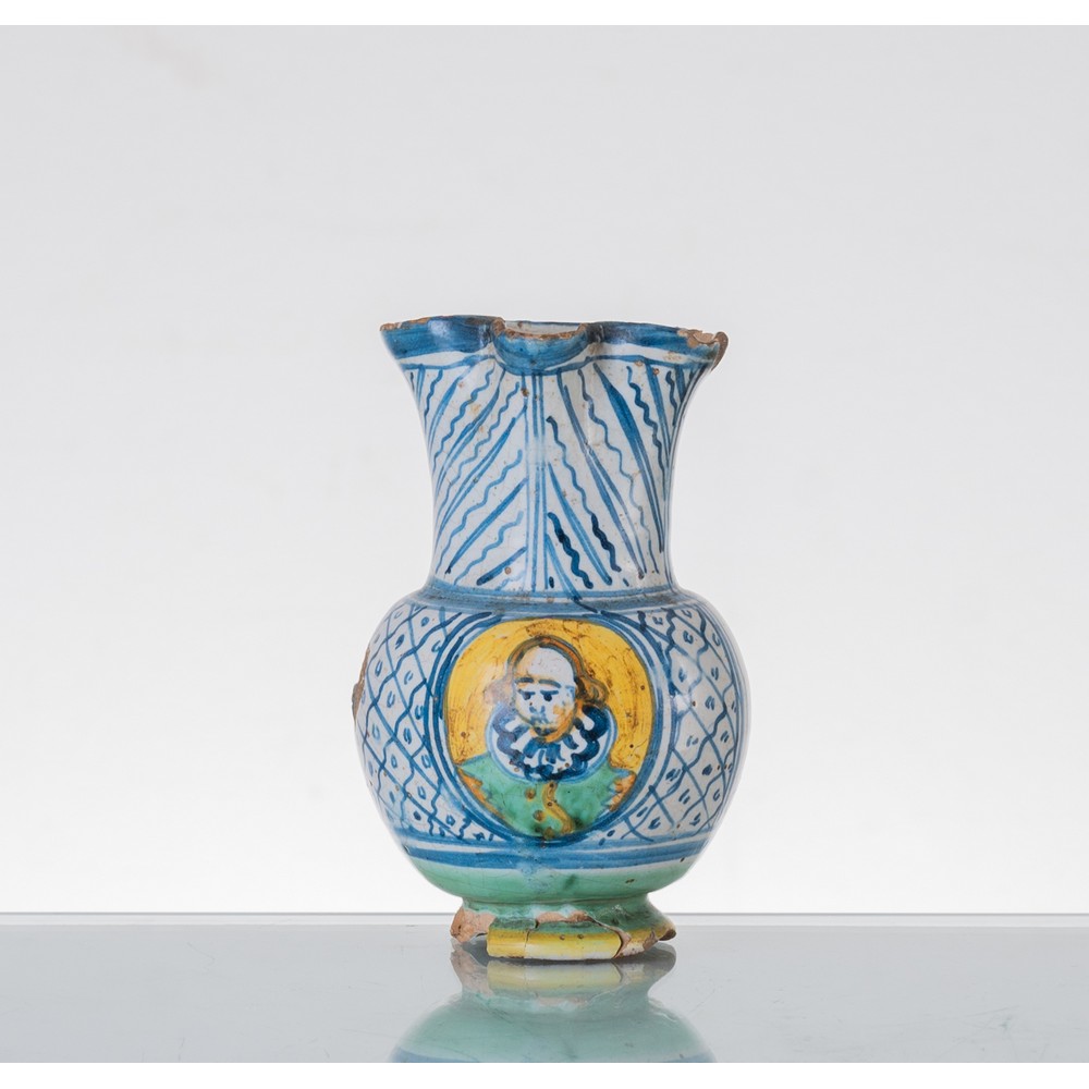 Piccola brocca in ceramica smaltata e decorata nei toni del blu con medaglione centrale raffigurante "Mezzo busto di gentiluomo" (rotture e mancanze).