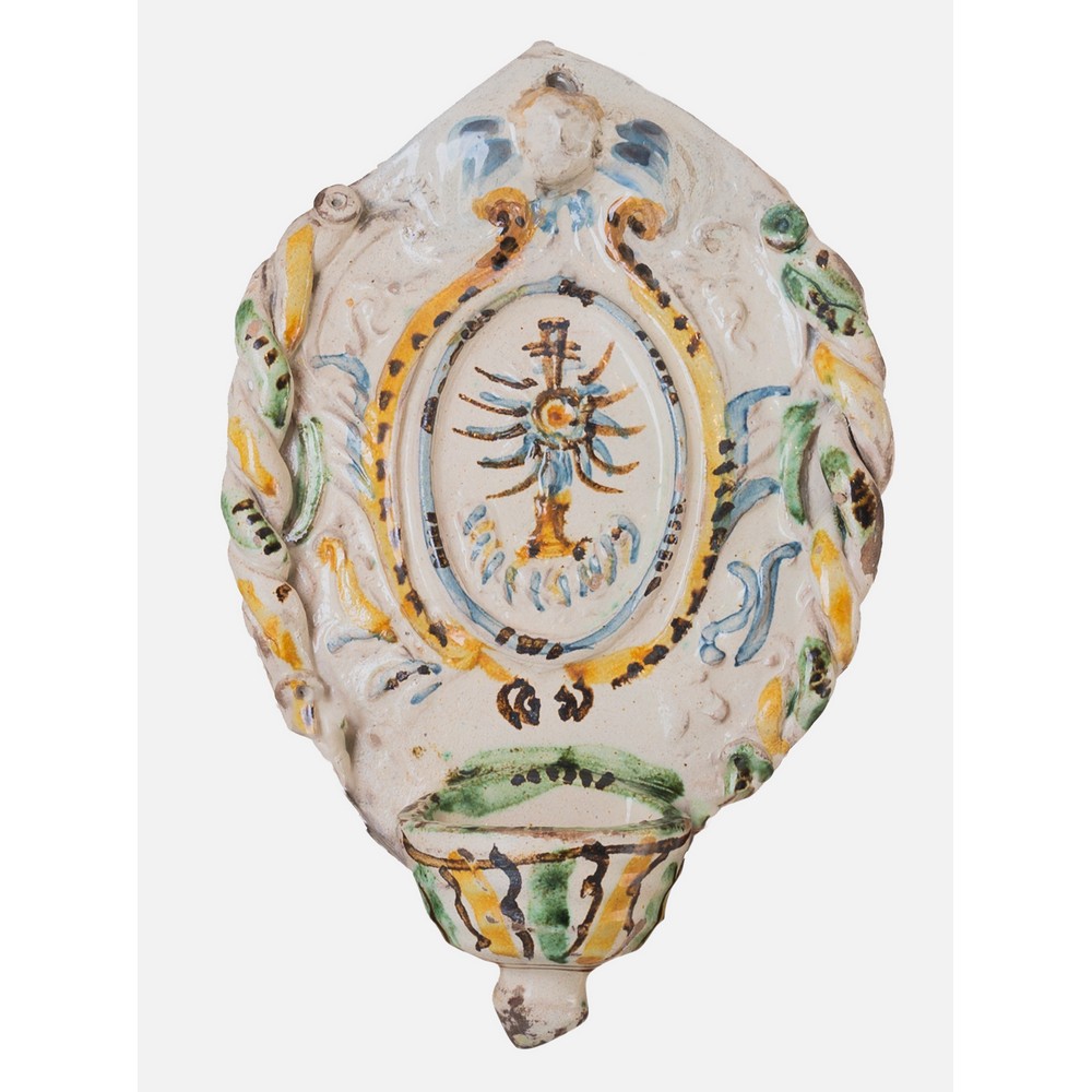Acquasantiera in ceramica smaltata e decorata con ostensorio al centro (usure).
