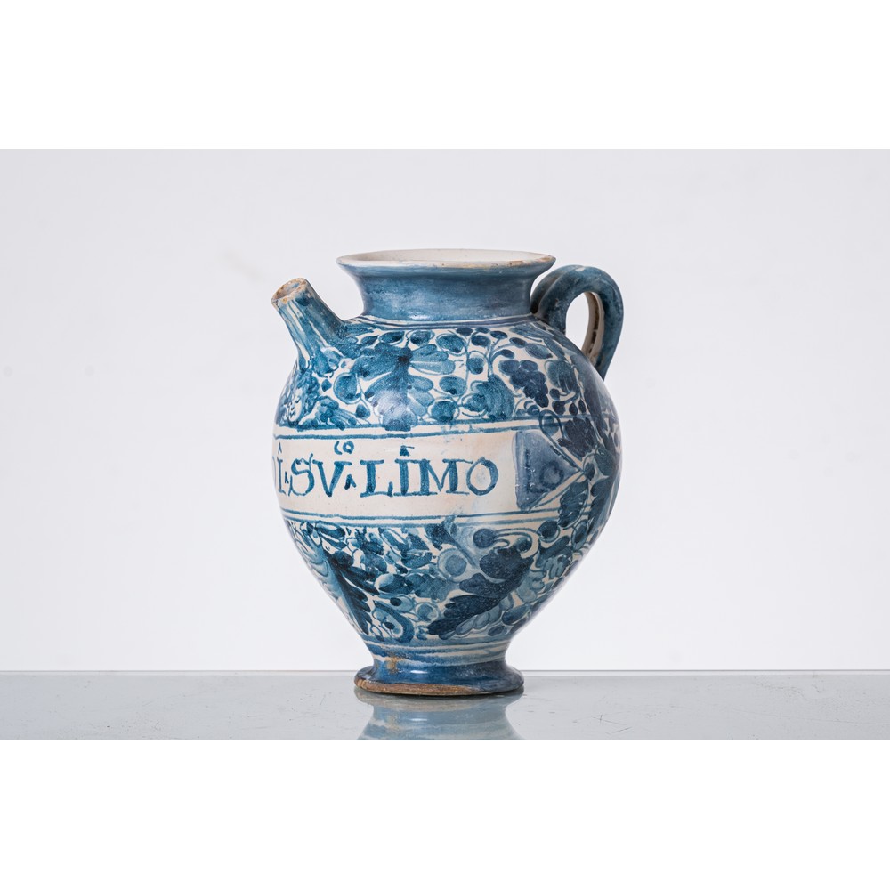 Versatoio da farmacia in ceramica smaltata e decorata a motivo fogliaceo (usure e restauri).