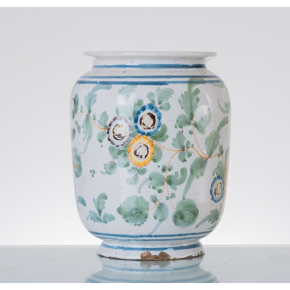 Cilindro in ceramica smaltata e decorata a motivo floreale e fogliaceo (usure).