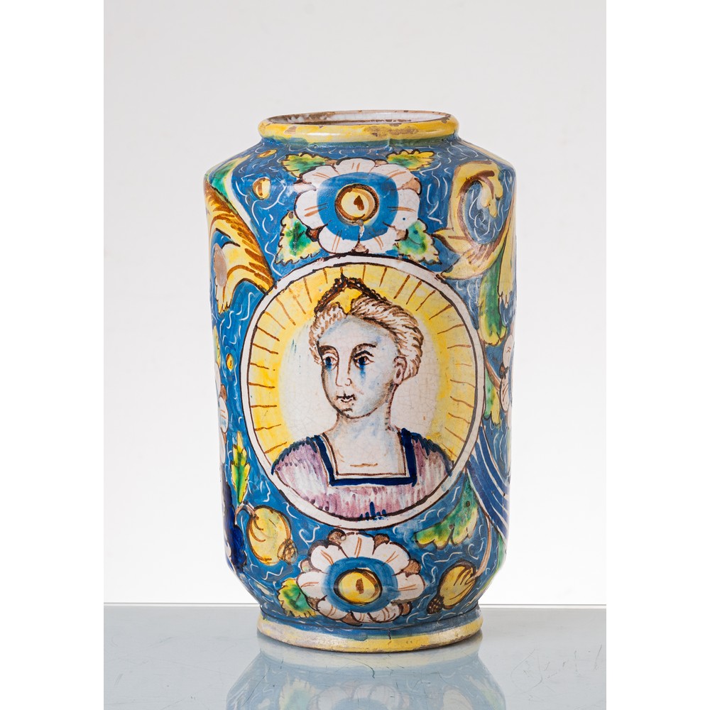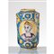 Grande cilindro in ceramica smaltata e decorata a motivo floreale con medaglioni raffiguranti "Mezzi busti di figure" (usure).