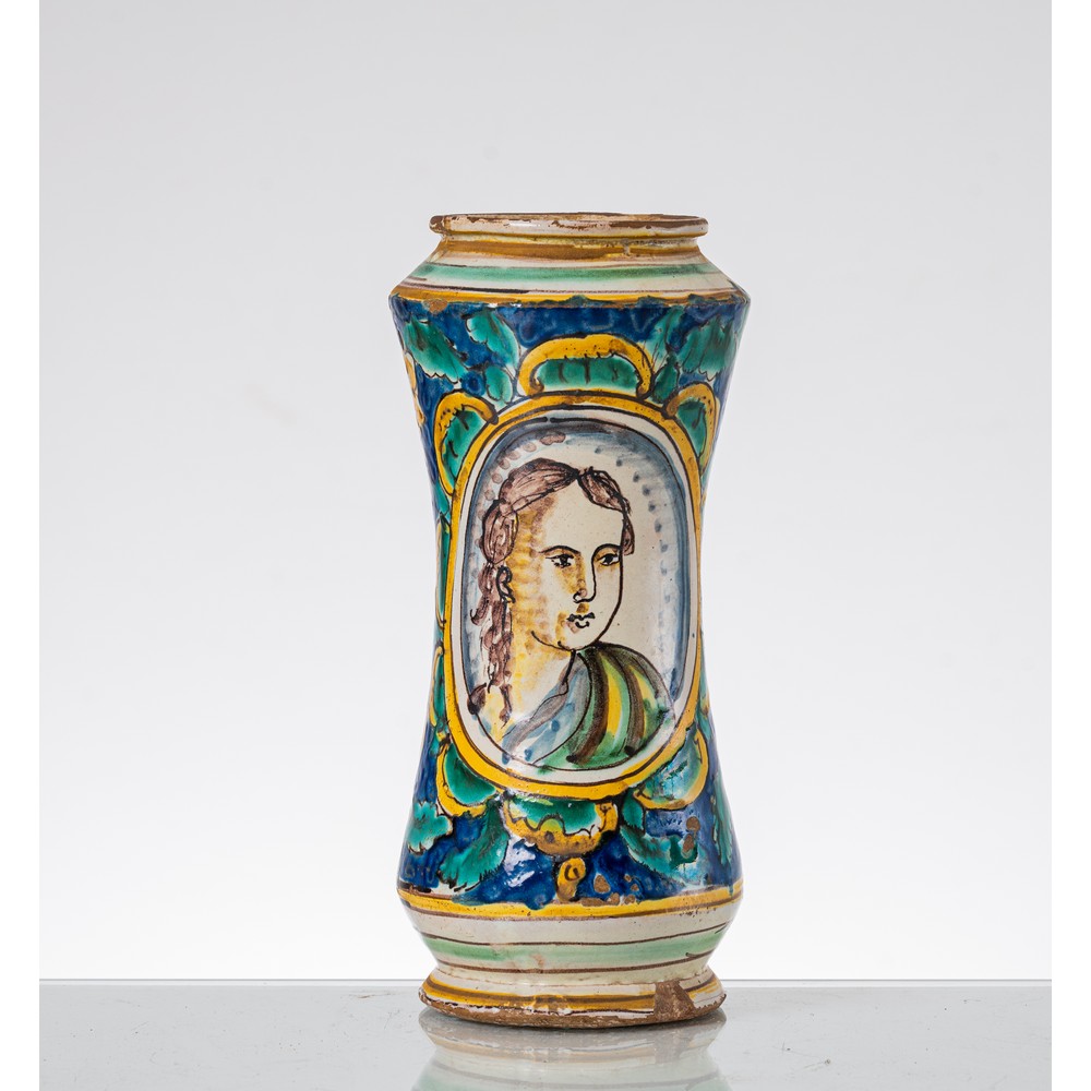 Albarello in ceramica smaltata e decorata a motivo floreale e fogliaceo con medaglione centrale raffigurante "Figura" (usure).