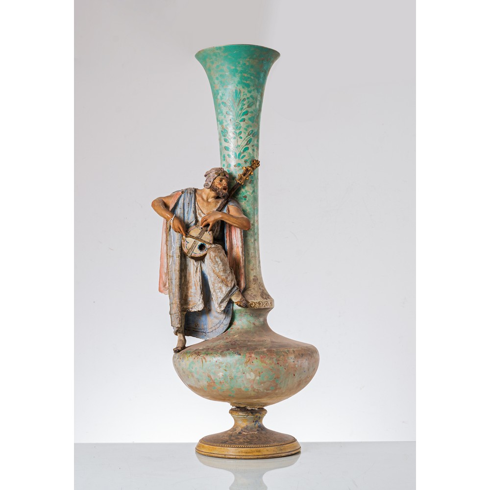 Grande vaso in terracotta policroma con scultura raffigurante "Figura orientale con strumento musicale" (usure).