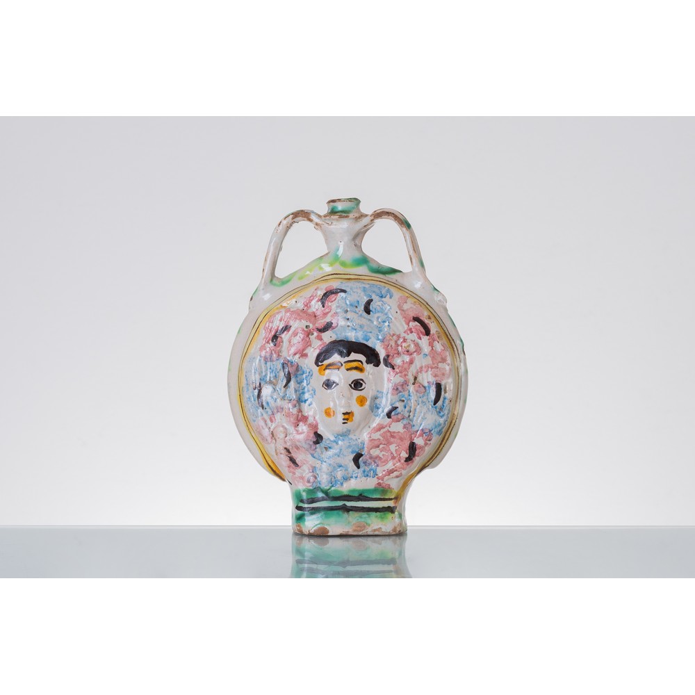 Fiasca in ceramica smaltata e decorata con al centro "Volti di figure" (usure).
