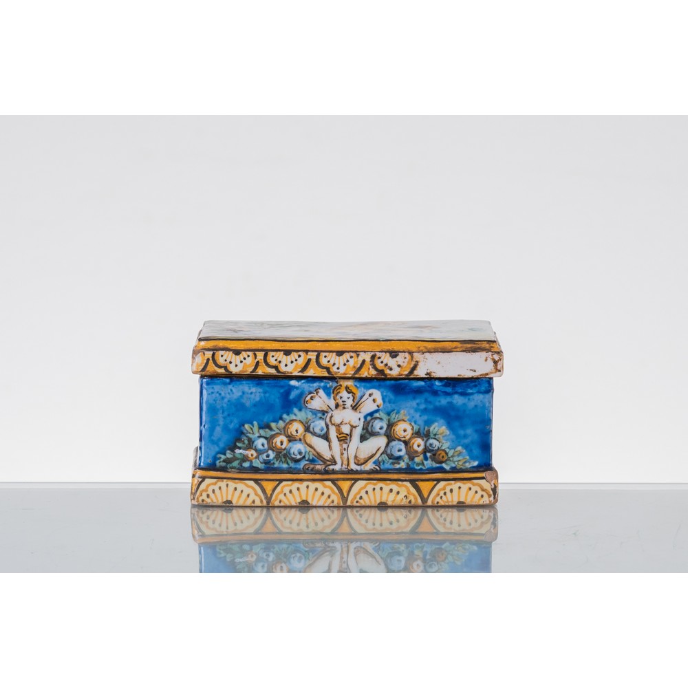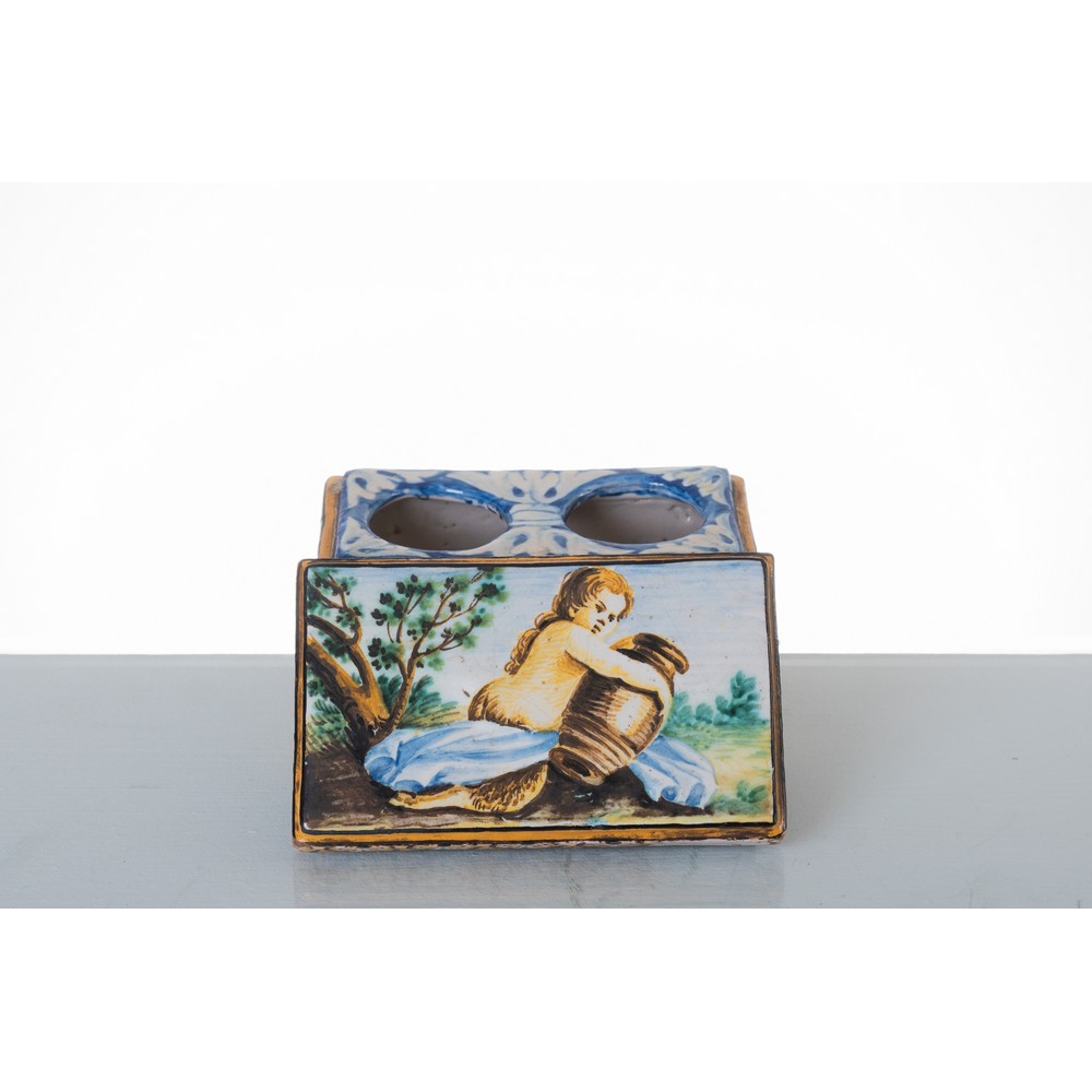 Calamaio con coperchio in ceramica smaltata e decorata raffigurante "Paesaggi con figure mitologiche" (usure).