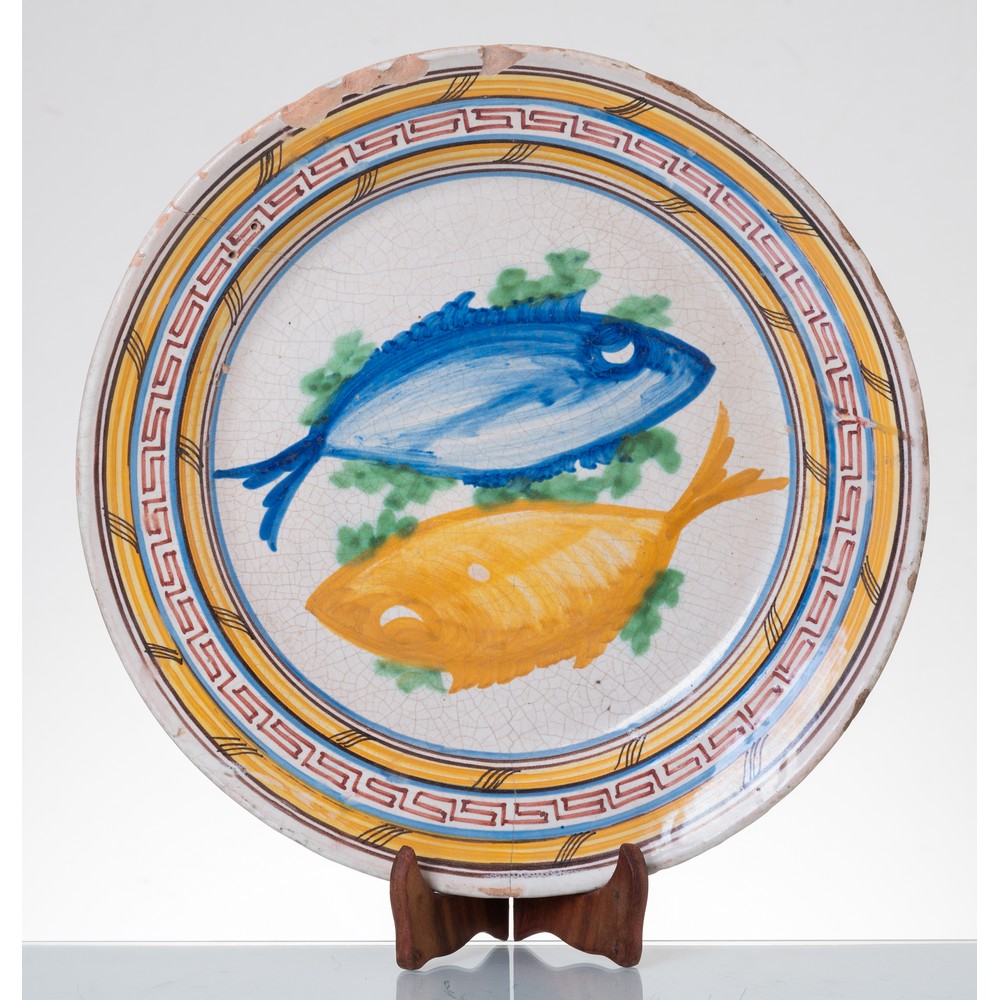 Fangotto in ceramica smaltata e decorata con al centro "Pesci" (usure e mancanze).