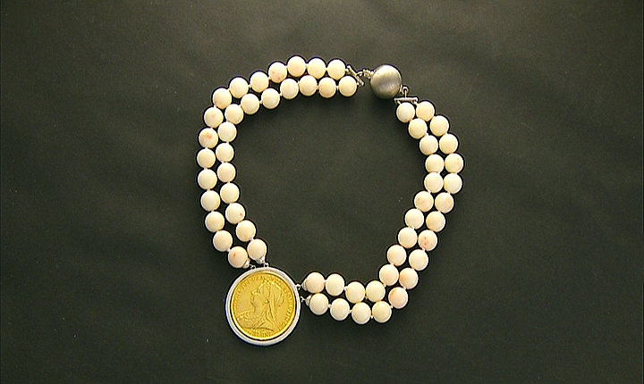 COLLANA. A due fili di sfere in corallo rosa, motivo centrale trattenente moneta antica (Corona del 1897) in argento dorato con chiusura a boule satinata in argento 925.