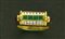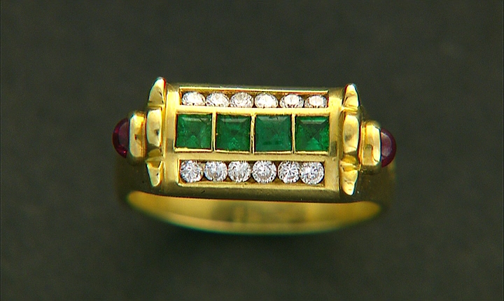 ANELLO. In oro giallo 18 kt sommità a ponte impreziosita da diamanti taglio brillante per tot. cts. 0,35 ca. incastonati a binario, decoro centrale in smeraldi taglio carrè per tot. cts. 0,30 ca. e rubini taglio cabochon ai lati per tot. cts. 0,20 ca.