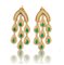 COPPIA DI ORECCHINI PENDENTI. In oro giallo 18 kt perno e clip, parte superiore a doppia voluta con bordure in filo ritorto da cui dipartono settori frangiati a goccia impreziositi da smeraldi taglio ovale cabochon per tot. cts. 5,00 ca., diamanti taglio brillante per tot. cts. 3,60 ca. a decoro.