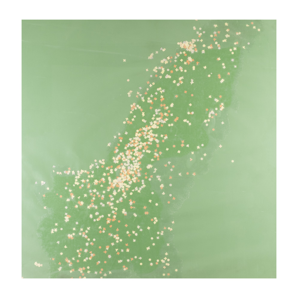 acrilico e coriandoli su tela, firmato sul retro, entro teca in plexiglass