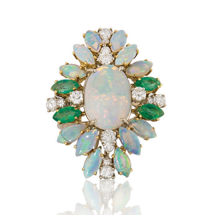 ANELLO. In oro giallo e bianco 18 kt sommità a fili lisci con decori in opali taglio ovale e navette cabochon per tot. cts. 6,40 ca., smeraldi taglio navette per tot. cts. 0,80 ca. e diamanti taglio brillante per tot. cts. 1,50 ca.