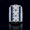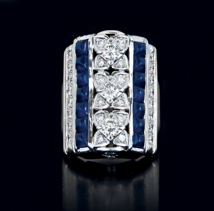 ANELLO. In oro bianco 18 kt internamente foderato, sommità rettangolare gradinata con settori impreziositi da zaffiri taglio fantasia per tot. cts. 2,00 ca. e diamanti taglio brillante per tot. cts. 1,40 ca.