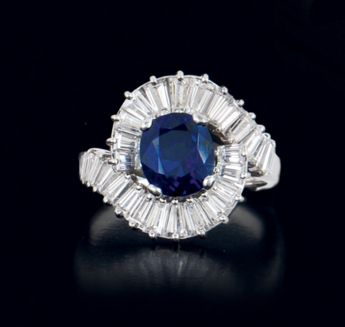 ANELLO. In platino centrato da zaffiro taglio ovale di cts. 2,20 ca. entro doppia cornice in diamanti taglio baguette e tapered baguette per tot. cts. 1,00 ca. (prob. colore G purezza VVS).
