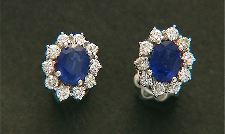 COPPIA DI ORECCHINI. In oro bianco 18 kt perno e farfalla con zaffiri taglio ovale per tot. cts. 1,80 ca. entro cornici in diamanti taglio brillante per tot. cts. 0,70 ca.