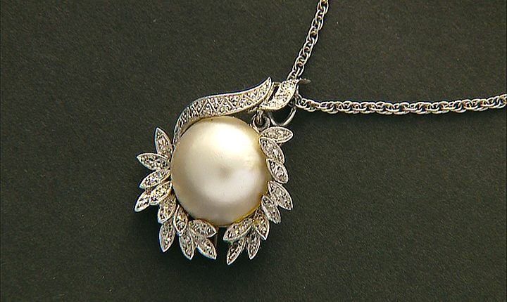 CIONDOLO. In oro bianco 18 kt centrato da perla mabè entro cornice floreale con bordure milligranate, trattenuto da catenina ad anelli in oro bianco 18 kt.