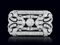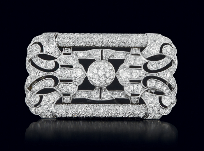 SPILLA ANNI '30 CA. In platino di forma rettangolare con decori a volute traforate e bordure milligranate, motivo a due diamanti taglio vecchio per tot. cts. 1,00 ca. entro decori in diamanti taglio vecchio, huit-huit e brillante (nel settore centrale) per tot. cts. 6,00 ca., chiusura ad ago semplice.