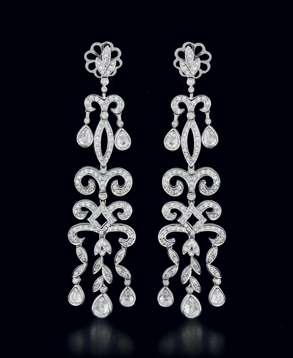 COPPIA DI ORECCHINI PENDENTI. In oro bianco 18 kt perno e farfalla, realizzati a volute incernierate disposte in verticale impreziosite da diamanti taglio brillante per tot. cts. 2,50 ca. e diamanti taglio rosa per tot. cts. 1,50 ca. su settori oscillanti.