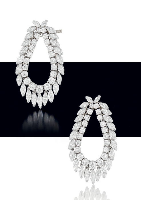 COPPIA DI ORECCHINI PENDENTI ANNI '50 CA. In platino a clip smontabili (trasformabili in spille mediante ricambio) realizzati a maglie incernierate impreziosite da doppie cornici in diamanti taglio brillante per tot. cts. 6,40 ca. e diamanti taglio navette per tot. cts. 10,00 ca. (prob. colore G purezza VS/VVS).