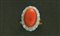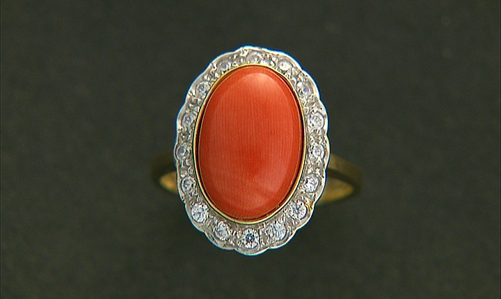 ANELLO. In oro bianco e rosè 18 kt montatura ovalizzata con bordi costolati centrata da inserto in corallo taglio ovale cabochon entro cornice in gemme incolore taglio brillante ad imitazione del diamante.