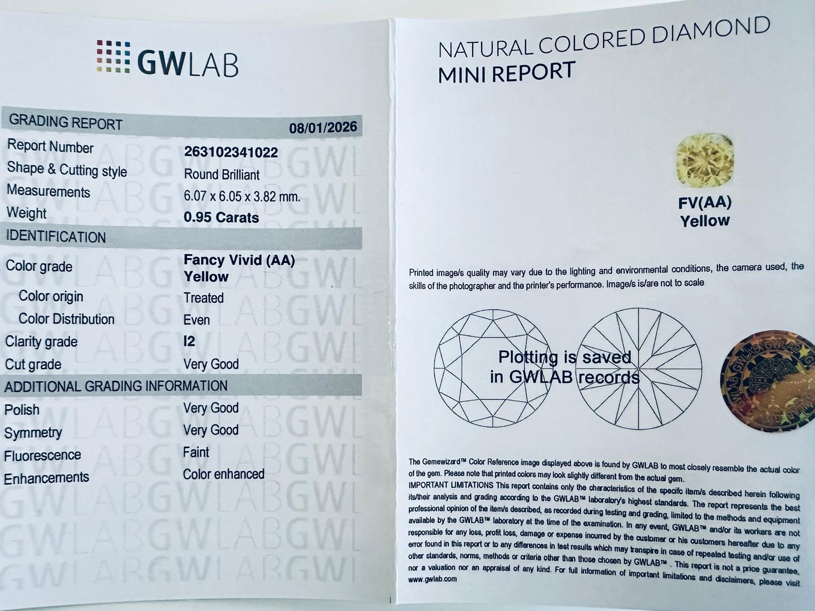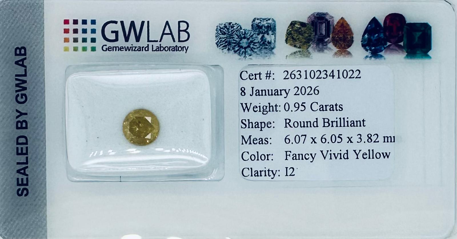 FANCY GIALLO VIVIDO (COLORE ESALTATO) 0,95 CT – PUREZZA I2 - TAGLIO BRILLANTE – C51207-10 - COMMISSIONE D’ASTA 25%