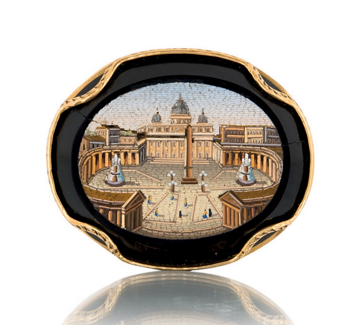 SPILLA XIX SECOLO. In oro giallo 18 kt trattenente micromosaico raffigurante piazza S. Pietro (visibili mancanze) entro cornice incisa, chiusura ad ago semplice.