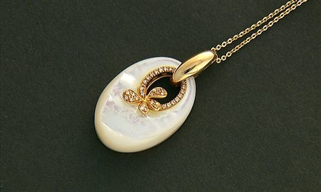 CIONDOLO. In oro rosa 18 kt di forma ovalizzata con inserto in madreperla sagomata e settore a fiore centrale, diamanti taglio brillante per tot. cts. 0,45 ca., trattenuto da fine catenina in oro rosa 18 kt.