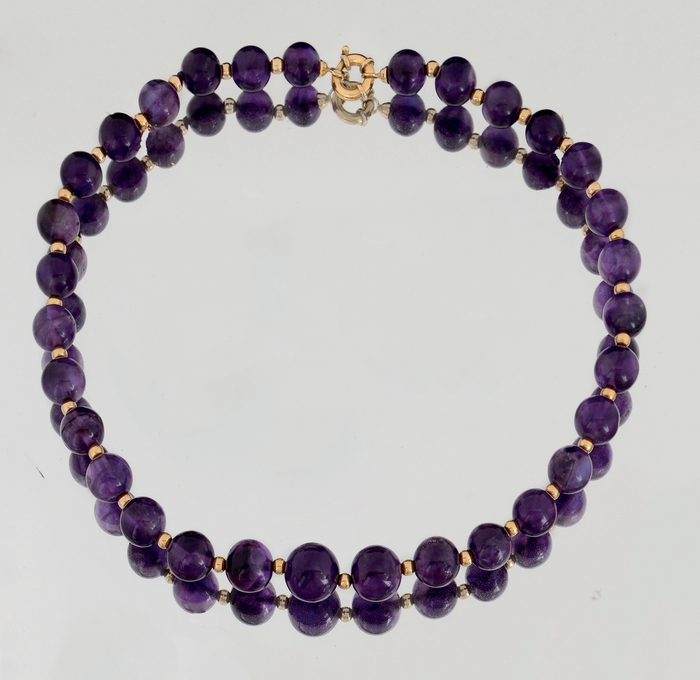COLLANA. Ad un filo di sfere in ametista disposte in gradazione dal centro con interruttori e chiusura in oro giallo 18 kt.