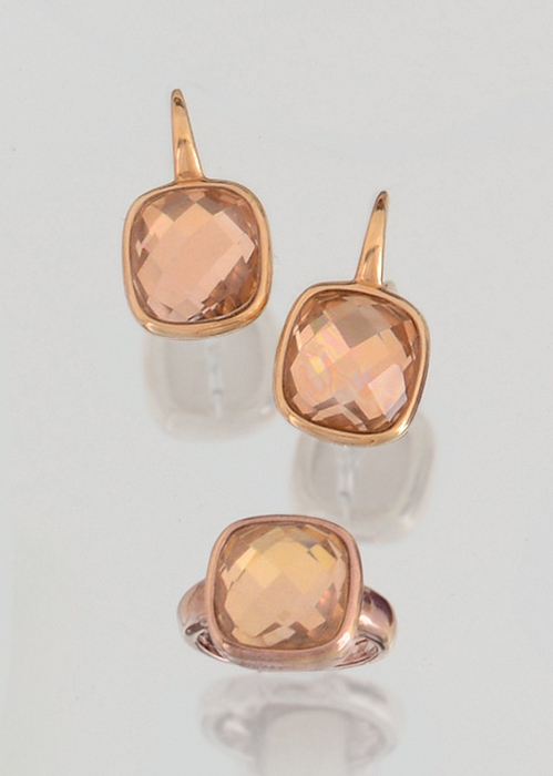 DEMI PARURE. In oro rosa 18 kt composta da coppia di orecchini a monachella e clip e da anello con inserti in quarzi rosa taglio briolette.