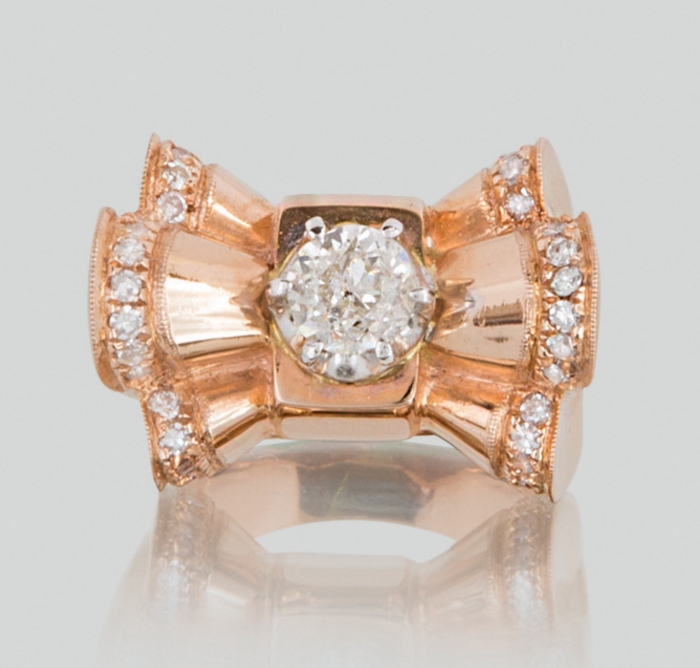 ANELLO ANNI '40 CA. In oro bianco e rosa 18 kt montatura a fiocco con diamante taglio vecchio di cts. 1,00 ca. impreziosito ai lati da diamanti taglio huit-huit per tot. cts. 0,60 ca. entro bordure milligranate.