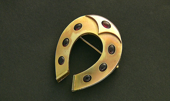 SPILLA INIZIO XX SECOLO. In oro giallo 9 kt realizzata a ferro di cavallo con motivi in granati taglio ovale cabochon e bordure lavorate a giorno, chiusura ad ago semplice.