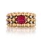 ANELLO ANNI '50 CA. In oro giallo 18 kt montatura a tre file di boules con motivo costolato nella parte inferiore, al centro rubino sintetico taglio ovale con decori ai lati in diamanti taglio huit-huit per tot. cts. 0,15 ca.