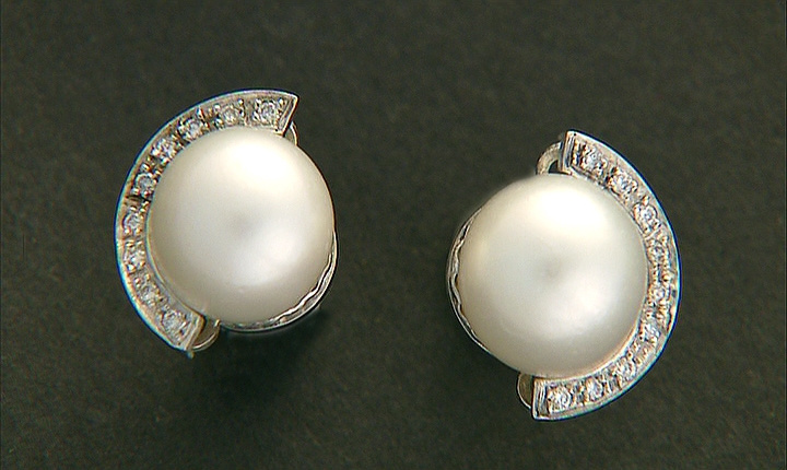 COPPIA DI ORECCHINI. In oro bianco 18 kt perno e farfalla centrati da perle coltivate South Sea di mm 12 ca. entro decori in diamanti taglio brillante per tot. cts. 0,20 ca.